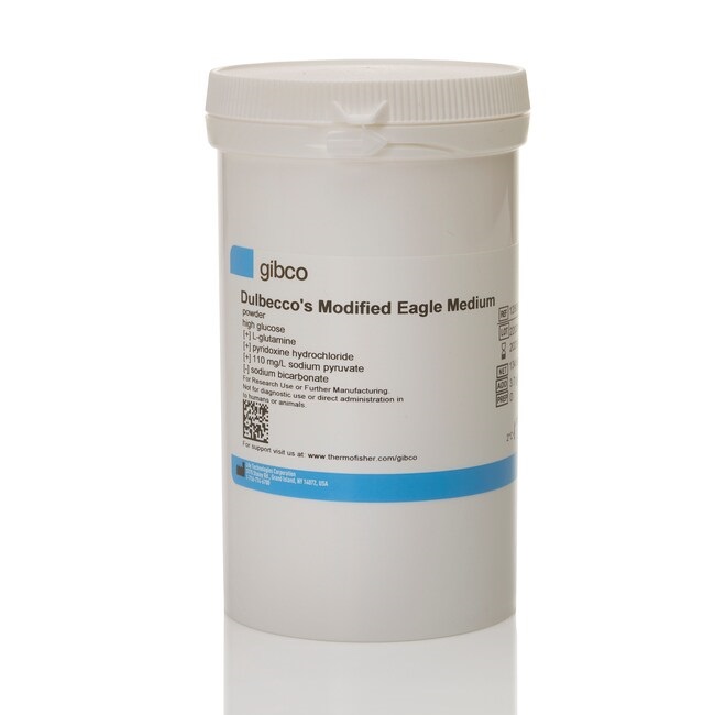 DMEM نسبت به سایر محیط کشت ها منحصر به فرد است، زیرا حاوی 4 برابر غلظت اسیدهای آمینه و ویتامین ها نسبت به محیط اولیه Eagle’s Minimal Essential است. DMEM در ابتدا با گلوکز کم (1 گرم در لیتر) و پیروات سدیم فرموله شد، اما اغلب با سطوح گلوکز بالاتر، با یا بدون پیروات سدیم استفاده می شود. DMEM حاوی پروتئین، لیپید یا فاکتورهای رشد نیست. بنابراین، DMEM نیاز به مکمل دارد، معمولاً با 10٪ سرم جنین گاو (FBS). DMEM از یک سیستم بافر بی کربنات سدیم (3.7 گرم در لیتر) استفاده می کند و بنابراین برای حفظ pH فیزیولوژیکی به یک محیط CO2 5-10٪ نیاز دارد. فرم های پودری محیط کشت سلولی Gibco™ به مکمل بی کربنات سدیم، تنظیم pH و فیلتراسیون در زمان آماده سازی نیاز دارند (برای جزئیات به پروتکل مراجعه کنید).